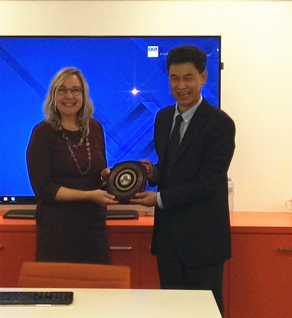 邵乐喜副校长与昆士兰科技大学国际合作事务官员交换纪念品