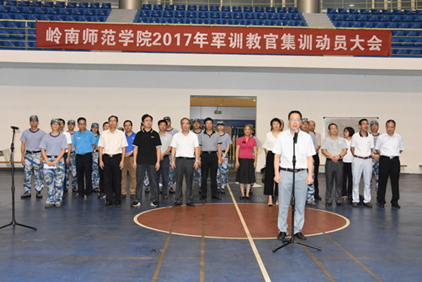 岭师新闻中心讯:7月3日上午,我校2017年军训教官集训动员大会在体育馆举行。学校党委副书记彭权群参加会议并宣布“岭南师范学院2017年军训教官集训”正式开始,副校长兰艳泽向学生教官代表授旗。会议由武装部副副长郑赞芳主持。