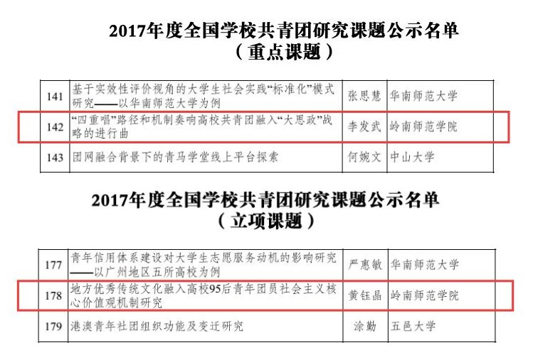 近日,共青团中央公布了2017年度全国学校共青团研究课题拟入选名单,我校两个项目获得课题立项。其中,李发武主持的《“四重唱”路径和机制奏响高校共青团融入“大思政”战略的进行曲》获重点课题立项,黄钰晶主持的《地方优秀传统文化融入高校95后青年团员社会主义核心价值观机制研究》获一般课题立项。