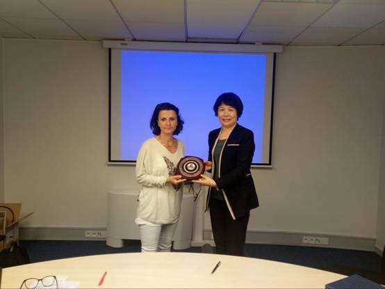 兰艳泽副校长向法国法阁思高等教育集团赠送我校校徽
