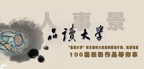 “品读大学”品读什么?征稿启事中指明,是品读大学里的人,那些由衷让我们心生敬意的师生员工;是品读大学里的事,那些总是令我们感动而难忘的事件;是品读大学里的景,那些天天让我们浸泡在其中,通过“观其景、品其文、悟其蕴、明其道”的校园景观。