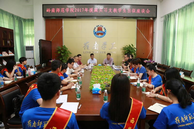 4月11日,我校举行2017年援藏支教志愿者出征座谈会, 欢送援藏支教志愿者。学校党委副书记黄达海、副校长邵乐喜出席会议并讲话。黄达海向援藏支教队伍授队旗。