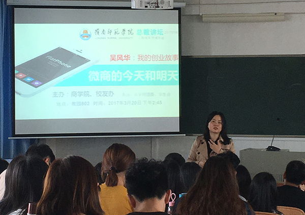 在校友办和商学院主办的“总裁论坛”上,吴风华为商学院学生分享了“微商的今天与明天”的主题演讲。吴风华以其丰富的企业实践经验、真实的创业案例,客观的理论分析,与广大学子分享“我的创业故事”。在市场分析上,她认为未来十年是养生行业爆发期,养生行业发展前景远大,投入小回收快;在创业伙伴联系上,她认为要寻找事业互补型的创业合伙人;在公司产品开发和运营上,强调传承与简易,抱持中医情怀,选择艾帖作为经营突破口。吴风华校友以浅显易懂的语言,意味深长的故事,幽默风趣的讲述使现场笑声掌声不断,论坛取得圆满成功。