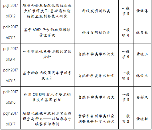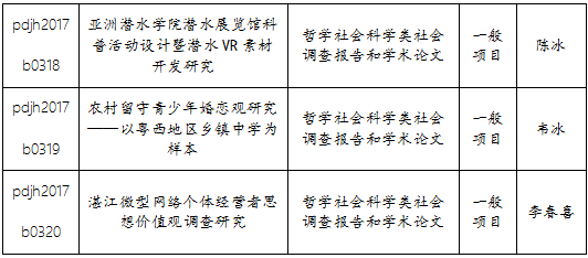 我校获得立项资助的15个项目涉及科技发明制作、自然科学、哲学社会科学三类。其中,由林泽涛同学主持的《修正引力黑洞的纠缠熵及其与黑洞相变联系的研究》和由朱洪伟同学主持的《文化自觉与新媒体:湛江非遗文化传承的“新声音”——以东海岛“人龙舞”和乌石“蜈蚣舞”的传播为例》分获自然科学、哲学社会科学类重点立项,《分层多色3d打印机结构设计与程序开发》等13个项目获得一般立项。