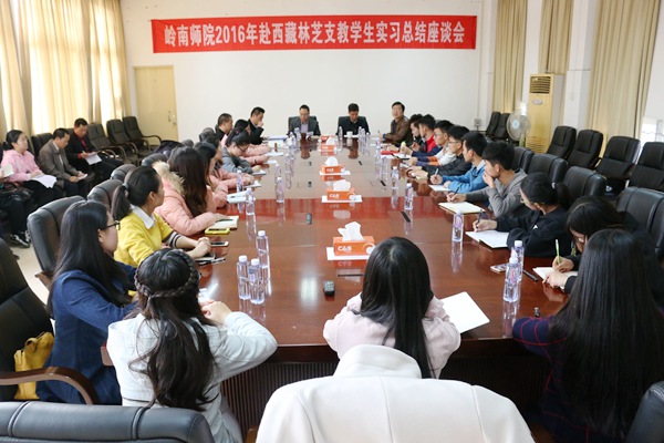 学生处李粤处长主持座谈会,并从组织方面通报了这次赴藏支教实习工作的具体情况;教务处刘惠卿处长也从教学方面通报了情况;党委宣传部关天冲副部长、学生处陈永国副处长也结合同学们的发言谈了感想。