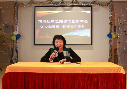 12月23日下午我校南海丝绸之路协同创新中心在学校鸿园二楼文化餐厅举行“南海丝绸之路协同创新中心2016年课题中期检查汇报会”。出席这次活动的有学校总会计师、南海丝绸之路协同创新中心兰艳泽主任,学校国际交流处郑志军处长, 南海丝绸之路协同创新中心常务副主任王亚新教授,南海丝绸之路协同创新中心副主任、科研处陈东英副处长,外国语学院莫海文副院长以及创新中心骨干成员30多人。