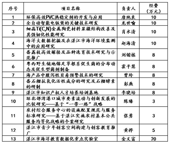 根据湛江市科学技术局、湛江市财政局“关于下达湛江市2016年度财政资金科技专项竞争性分配项目的通知”(湛科【2016】131号文件),我校共有13个项目获得立项。 湛江市2016年度财政资金科技专项竞争性分配项目共安排项目108项,经费1335万,我校获立项13项,获资助经费111万元,占全市12%。