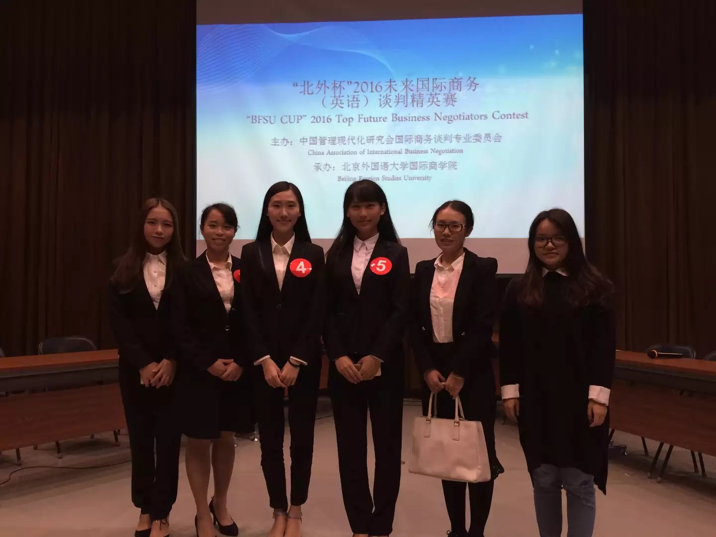 中国管理现代化研究会国际商务谈判专业委员会主办和北京外国语大学承办的“北外杯”2016未来国际商务英语谈判精英赛于10月15日至16日在北京外国语大学举行,我校外国语学院林海、谢丽娴、宋延兰老师带领商务英语专业13级邓伟霞,王倩媛,曾晓群,卢皓月,尤兆豪和14级冯丽雯同学组成的谈判队代表我校参加了这次大赛,最终获得了二等奖的第一名。我校外语院选手曾晓群被评为优秀谈判手。