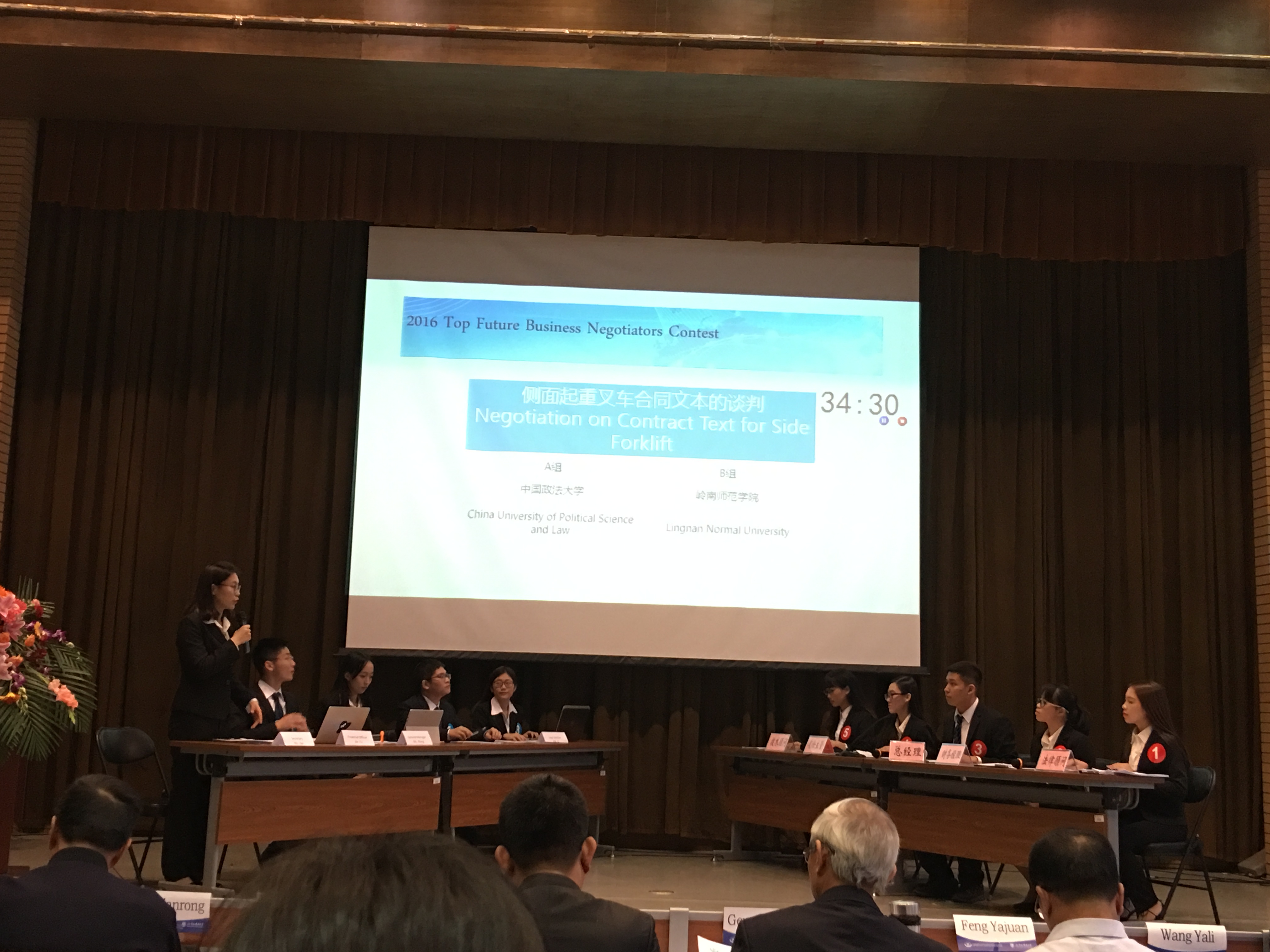 我校这次对战的对手分别是中国政法大学和北京第二外国语学院。第一天比赛进行的是比较简单的侧面起重叉车合同文本的谈判,双方对谈判的方向都达成较为一致的共识,除了在一开始对材料中解读的贸易术语选择方式上存在分歧。本着维护自身利益的立场,后来经过双方进一步的交涉和沟通,双方决定使用cip贸易术语。第二场谈判,双方进行的是铜管制造专利纠纷的谈判,这里涉及专业的专利估值和专利侵权索赔的问题。对方一开始就矢口否认他们有专利侵权的过失,于是在一开始有点紧张的谈判氛围里,我院选手不紧不慢地和对方周旋,争取掌握谈判主动权。最终我们在利润分成和专利使用费的问题上僵持不下,因为时间问题,最后双方都退一步,达成专利使用费的共识,圆满地结束了谈判。赛后,评委对我校选手提出的关于未来五年利润分成的方案表示赞赏。