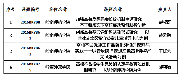 近日,从广东高校党建研究会2016年党建研究课题立项的通知获悉,今年全省本科高校共有224项课题申报。经组织专家组评审,评选出重点课题6项,一般课题98项。我校共有4项党建研究课题获得立项。