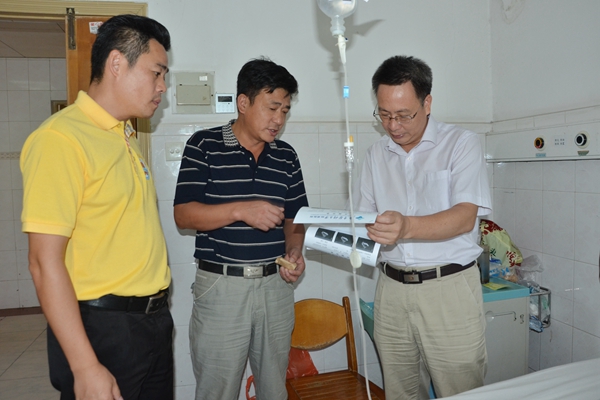在病房里,彭权群副书记对金伟同学说:“学校领导一直都很关心你的病情,听说前段时间病情有所反复,但经过一段时间的治疗整体趋好,病情已经稳定并正在巩固疗效。和上次看望你的时候相比,你的气色和精神都明显变好,这让我们很欣慰,也说明你很坚强!”“也请你和家人放心,学校、老师和同学们会是你最坚实的后盾的!”在病床上的金伟同学向彭权群副书记及李粤处长反映了这段时间的治疗情况,感动的说:“感谢学校领导和学生处领导的关心,也感谢这段时间美术学院老师和同学们对我的照顾!我会尽快好起来的!” 金伟父亲也说:“感谢学校领导几次过来看我小孩,以及学院老师和同学们对我小孩无微不至的关心,我很感动,谢谢你们!”