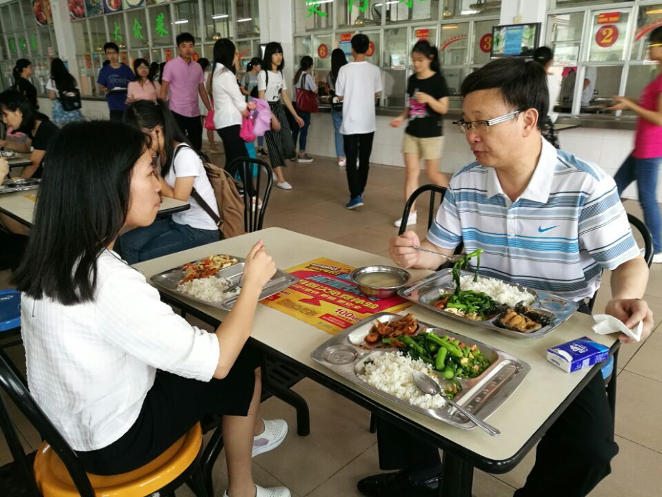 5月14日中午,学校李江凌副校长到饮食服务中心泽园食堂检查工作,并与学生一起用餐,听取同学们对饭堂工作的意见和建议。饮食中心吕冬主任等陪同。