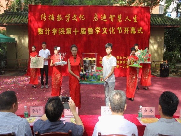 彭权群在致辞中说,数学文化节作为在学校较有影响力的活动,历经十年打磨,已形成规模、彰显成效,推动数计学子在国家、省、市和学校等各类学术科技竞赛和专业技能大赛中取得优异成绩,包括全国数学建模竞赛获国家二等奖,全国“挑战杯”大学生课外学术科技竞赛获广东省特等奖等等。数学文化节不仅在学院内营造了浓厚的学术氛围,为学生搭建了一个综合技能全方位演练的平台,而且逐步打造成具有鲜明专业特色的校园文化品牌,曾获得广东省校园文化建设优秀成果奖。彭权群认为,数学文化节做到了创新内容,实现与专业知识、专业技能和考研就业以及学术科研相结合;创新形式,开展校地合作,拓宽大学生专业实习、实训平台;创新宣传,发挥新媒体优势,扩大活动影响等,激发学生学术兴趣,提高学生综合素质,为考研就业打下了坚实的专业知识基础。他衷心希望,数计学院领导班子能凝心聚力,集中学院优势,不断整合校内和校外资源,充分发挥校友力量,提升内涵,打造品牌;教授、博士带头,所有老师都能积极投入,参与策划,用心指导,提高活动水平和成效;广大学生都能踊跃参加,充实学习,勇当先锋,在活动中领略知识,增强能力;数学文化节能把影响力扩展到全校乃至全社会,不断完善与创新,使数学文化节成为学生活动中的亮丽品牌,从而为建设特色鲜明的高水平师范大学贡献一份力。