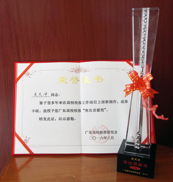 岭师新闻中心讯:日前,广东省高校校报研究会换届大会暨2015年年会在佛山高明召开,会上表彰了为校报默默耕耘了10年以上的优秀工作者,我校宣传部副部长、新闻中心副主任关天冲以在校报18年的经历和成果,被授予广东高校校报“突出贡献奖”。