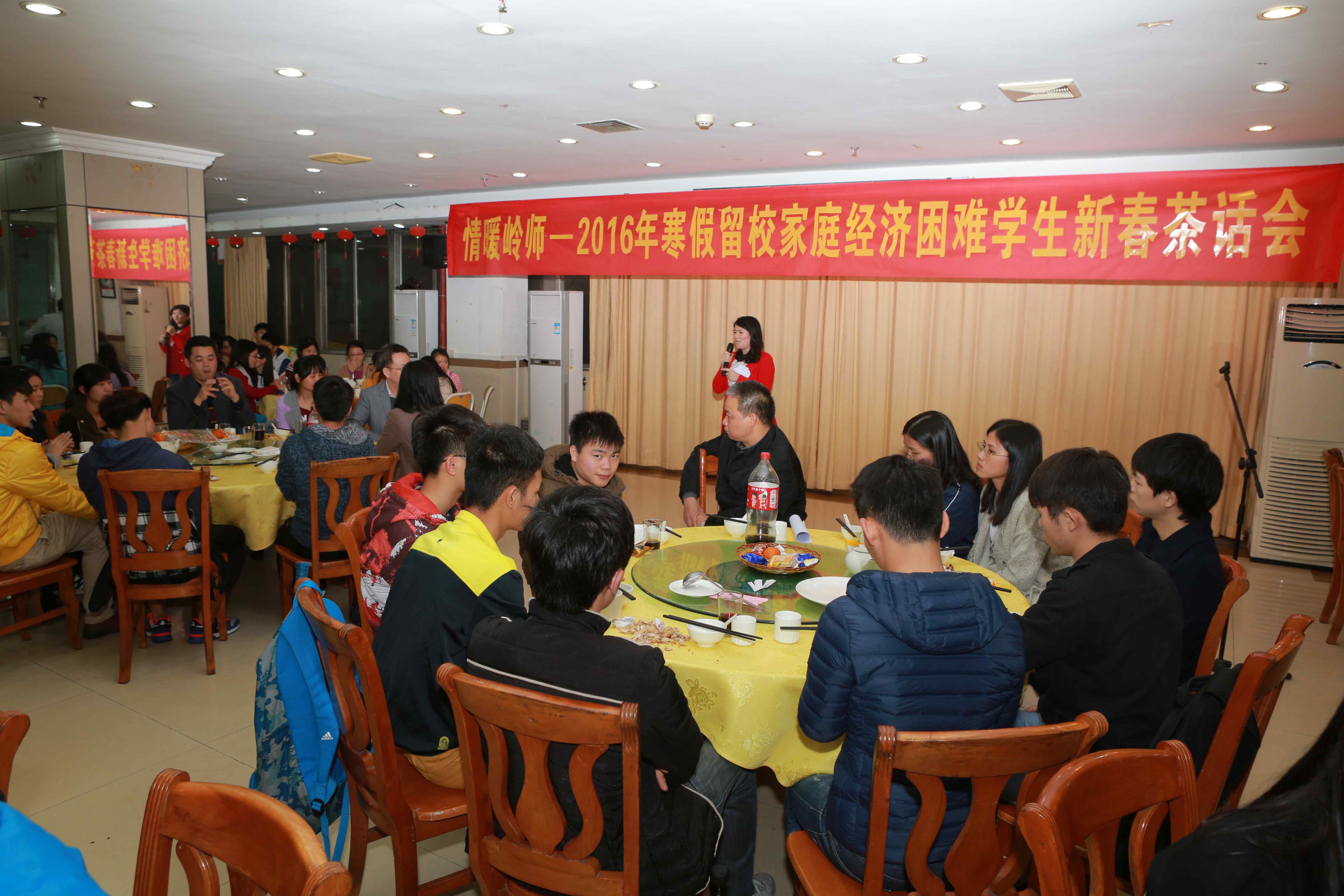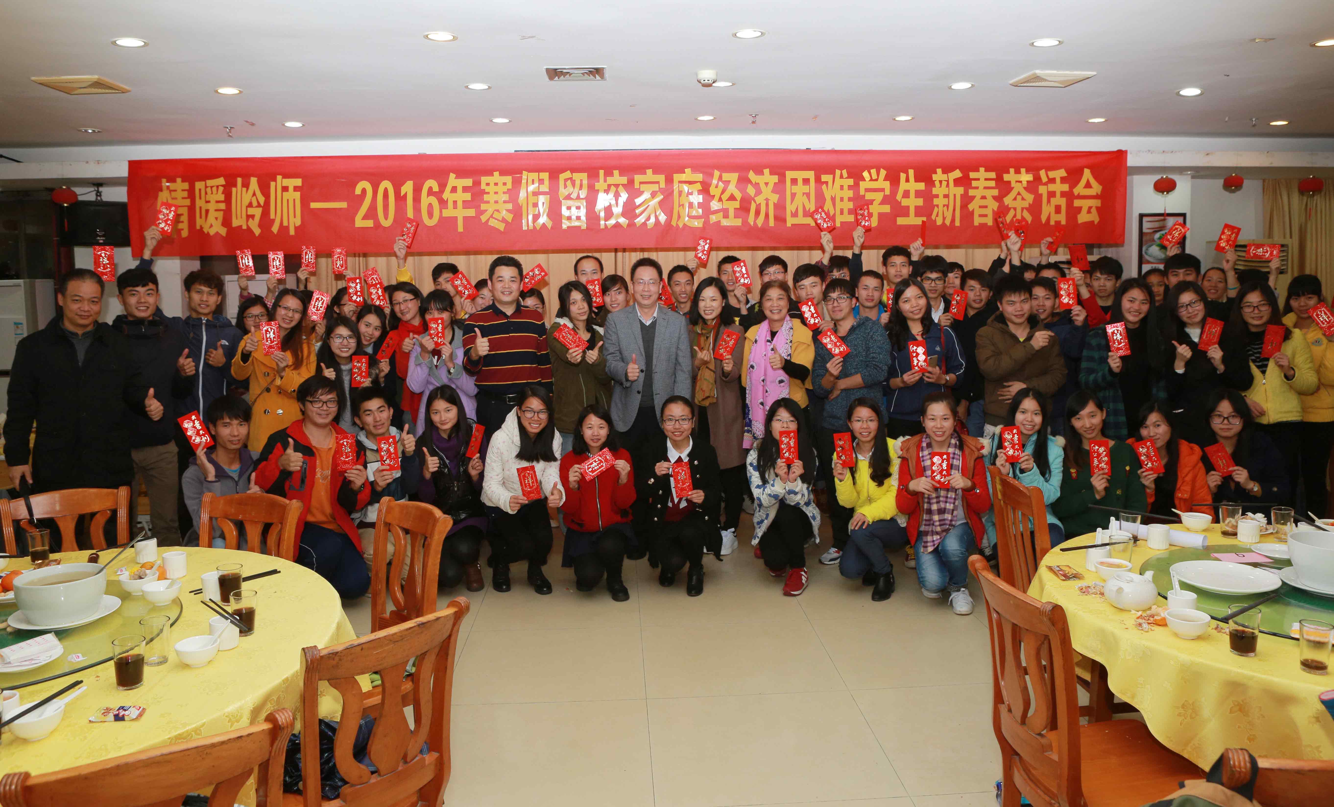 2016年新春佳节来临之际,学生处于2016年1月31日下午在园府酒店二楼大厅开展了“情暖岭师—2016年寒假留校家庭经济困难学生新春茶话会”。学校党委彭权群副书记,学生工作部(处)李粤处长,正处级干部李爱群,陈永国、易如副处长以及学生处各科室负责老师与近三百名留校的家庭经济困难学生欢聚一堂,共同庆贺新年的到来。