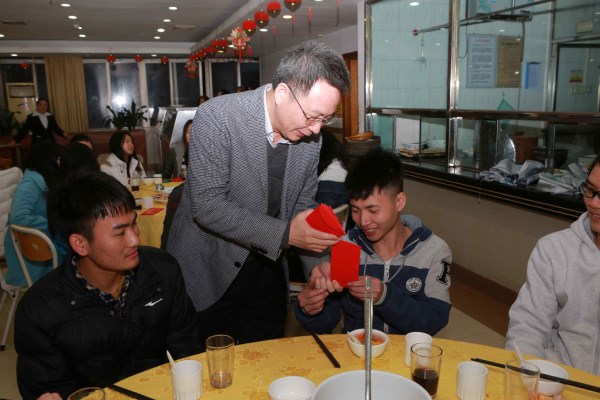 最后,彭权群发表新春致辞,他满怀深情地向同学们说:“学校是你们永远的家,无论过去多少岁月,学校都欢迎你回家。希望在学校过年的同学也能获得家一样的温暖。”一番话语让在场的同学们倍受感动。彭权群还说起这两年走访经济困难学生家庭的感受,他说,在走访过程中,家长们都非常感谢和支持学校的助学工作,这让他感到非常欣慰,而家长们砸锅卖铁也要坚持孩子教育的那种精神也令他非常感动,尤其对我们在教育前线努力的工作干部有极大的触动。家长们和学校的新年愿望都是一样的,希望孩子们健康幸福,学有所成!他也特地向同学们提出了三点建议,一要常打电话,多向家人报平安;二要遵纪守法,注意安全;三要珍惜时间,精心提升。