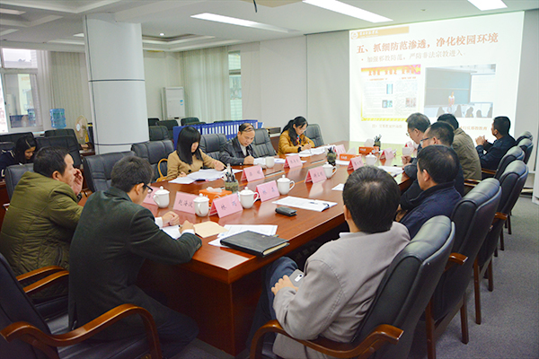 彭权群代表全校师生员工对张副主任一行的到来表示热烈欢迎,并向市考评组汇报了我校2015年综治以及平安建设工作情况,总结为五个方面:一是抓好组织建设,落实综治责任,坚持责任签约与完善制度,明确综治分工与规范综治考评机制;二是抓紧重点工作,建设平安校园,加强治安防控并提高整体防控水平;三是抓牢基础工作,维护校园安全即认清反恐形势,开展专项整治,完善管理制度与规范人口管理;四是抓实安全宣教,发挥教育成效;五是抓细防范渗透,净化校园环境,加强邪教防范与禁毒教育。这五个方面的工作强化了学校综治及平安建设的力度,促进了平安建设工作的顺利开展,为全校师生学习与生活提供良好的安全保障。