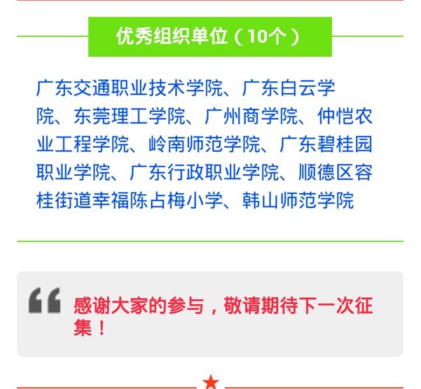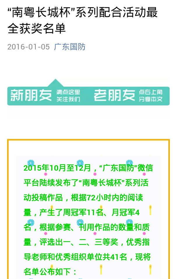 近日,由省委宣传部、省教育厅、省军区司令部、省军区政治部联合主办,以“助力强军梦,托举中国梦”为主题的广东省“南粤长城杯”系列活动再次传来喜讯,我校在此投稿作品评选中荣获“优秀组织单位”称号,外国语学院李百年凭借多项作品获一等奖;武装部张继伟、邓剑辉,美术学院谢金晶、信息学院冯鹏霖、苏杏伟以视频作品《军训改革进行时》获二等奖;邓剑辉荣获“优秀指导老师”称号。
