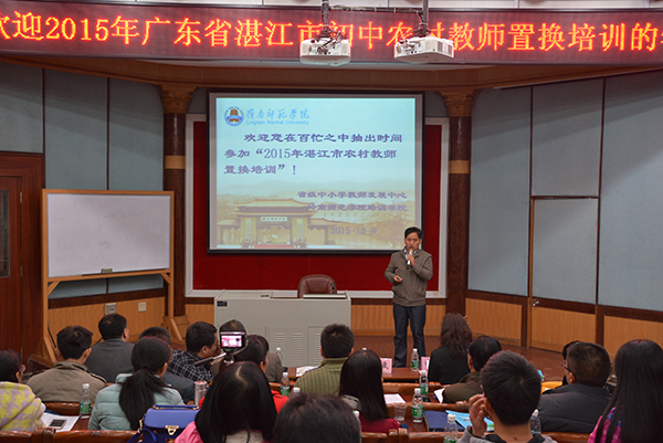 黄崴副院长代表学校致辞。他指出,省教育厅组织开展的农村中小学教师置换培训,目的在于推动我省城乡和区域之间的教育公平,从规范化、标准化的层面提高专业知识,提升专业精神,促进农村中小学教师的专业发展。我校作为省属师范高校,责无旁贷当应为农村教师的专业发展提供强有力支撑,通过创新培训内容与模式更好地为农村教育发展服务。他认为,我校的培训资源在全省同类院校中具有较好的优势,师资力量比较雄厚,学科专业比较齐全,教师教育优势突出,国际交流合作频繁,办学理念先进。我校依托这种优势尤其是教师教育学科的优势,在中小学教师培训方面做了大量工作,有丰富的经验,得到省教育厅的充分肯定。他表示,我校正以建设“广东省中小学教师发展中心”为契机,按照省教育厅提出的“立足粤西、服务广东、辐射全国、国际知名”目标,加强培训管理团队、师资团队建设,举全校之力整合培训资源,努力打造培训品牌项目、培训名家名师和培训精品课程,切实加强校地联动,协同创新,形成以学前教育、基础教育、职业教育、特殊教育师资培训为主体,以公务员和行业、企业人员培训为重要方面的完整的培训体系,把我校培训学院打造成为国内有影响的教师培训高地。他希望培训学院要顺应信息化、全球化、多元化背景下中小学教师、中校学校长培训多样化需求,努力改进培训理念、培训管理、培训服务、培训方式和培训手段,改善培训条件,高起点、高标准做好培训项目的研发设计和组织实施工作。要求学员要珍惜这次培训学习机会,学有所获。