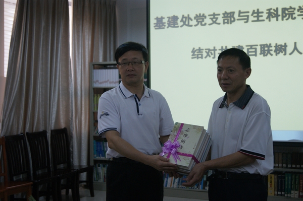 在随后的赠书仪式上,李江凌副院长代表基建处党支部向生科院学生党支部赠送了《最美散文》等文化丛书,希望广大学子要多读书,读好书,用优秀的文化丰富个人的精神世界,培养健全的人格。接着侯平均、梁伟民等教工党员也分别向结对学生赠送了《4000种观赏植物原色图鉴》、《心理学与生活》等书,并希望通过“共读一本好书”活动实现共同进步。