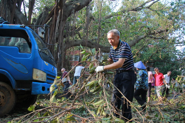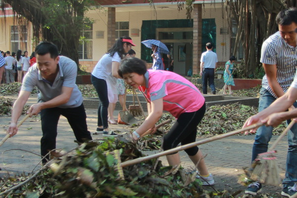 古榕广场上了堆积厚厚一层的断树、枝叶等杂物,虽经后勤人员日以继夜清理仍未完成,清理工作相当繁重。党员同志们无分岗位级别共同劳动、分工协作,形成了热情高涨的工作场面。有些党员同志负责协助后勤人员将树干和树枝装车,小树干一人传递,大树干合力搬移,党员同志们默契地配合着;树枝装车前先作整理,以求每一车都能稳稳当当的满载而去。有些党员同志负责清扫广场上的落叶,有的用扫把,有的用铁铲,不多久广场多日未见的青砖便露出了真颜。为方便清除装车,有些党员用斗车把碎叶运到广场旁边堆积,但是斗车数量不足,运载速度跟不上,聪明的机关党员干部们于是自创了一架人力“推土机”,利用一扇废旧门板,系上废旧的缆线,横放门板,前方多人拉,后方多人推,竟然能把一堆堆的碎叶快速地推移到广场旁,在众人的呐喊加油中,这辆人力“推土机”不停的运作,工作效率很高,党员同志们汗流浃背,精神抖擞。经过近两小时的劳作,清理活动已见成效,古榕广场上断树干和树枝已被清除,堆积在广场上的碎叶及其他杂物已被清理至广场旁暂时堆放,方便接下来的装运,古榕广场内终于回归到台风前干净整洁的状态。