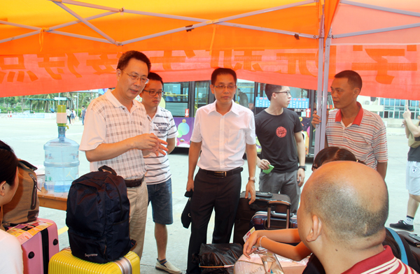 接着,彭副书记一行到达麻章车站,此时已接近正午,烈日炎炎,见学生干部们始终以最热情饱满的精神,最周到细致地服务迎接新生,各项工作进展地有条不紊,彭副书记高度肯定了学生干部的工作。彭副书记还与现场迎新的学生干部分享了他在大学当学生干部的经历,动情地表示当学生干部是一种锻炼,是在大学期间得到的另一种独特经历。他鼓励现场的迎新干部要把自己本身这种正能量的思想传播给新同学,传播青春正能量!随后,彭副书记与刚到站的新同学进行了亲切的交流,表达了学校的欢迎之情,也希望他们在大学里保持一个高效的学习状态,努力做到德智体美劳全面发展。同时鼓励他们争取成为一个学生干部,并祝愿他们有个美好的大学生活,四年后学有所成!