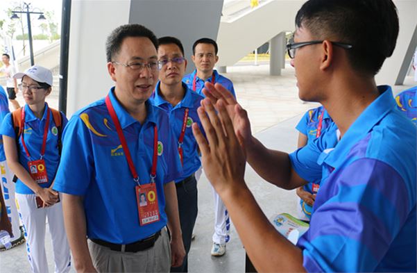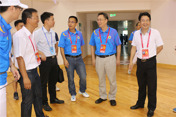 顶着烈日,彭副书记一行来到奥体中心,一路走访,与青年志愿者们一一握手,热切恳谈,详细地了解篮球志愿者的服务概况,细心地询问他们工作的情况,并且切实地为志愿者们解决很多实际问题。在篮球馆视察工作的团市委李志鹏书记对我校的志愿者赞不绝口,称岭师的志愿者无私奉献,为省运会提供了一流的服务,非常了不起。