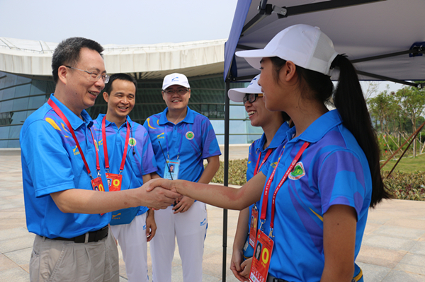 除了走访馆内志愿者,彭副书记一行还特别慰问了场外志愿者。场外志愿者的安排也井井有条,每一个指示牌附近都设有服务点,而且进行轮班制,场馆内外的志愿者轮流换岗。彭权群副书记称赞服务点的设置非常人性化,合理配置,管理到位。他表扬了场外志愿者的爱岗敬业,即使是在热辣的太阳下,志愿者们依然笑容可掬,身姿笔挺,动作规范,以标准的手势指引车辆,引领观众入场,对于市民们提出的问题也耐心地一一作答,充分呈现了激情四射的志愿者风范。彭副书记对于志愿者们的安全问题十分重视,多次嘱咐道,为了防止中暑,一定要加快场外志愿者的轮换,保证饮用水和盒饭的及时供应。而且,不管场内还是场外,同学间要互帮互助,不仅要保持服务热情,还务必要注意安全,为省运会提供更优质的服务。