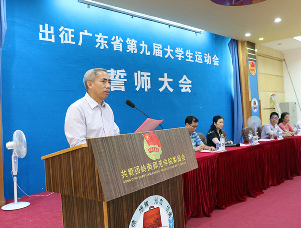 随后,刘周堂副校长作动员讲话,他代表学校对运动员,教练员的刻苦训练,积极备战表示崇高的敬意和亲切的问候。同时也指出,体育是岭南师范学院的金字招牌。并对出战大运会的运动员们提出五点希望:一,不负重托、不辱使命、静心备战、刻苦训练,始终以最饱满的热情投入比赛;二,顽强拼搏、奋勇竞先,坚持狭路相逢勇者胜的信念;三,虚心学习、提高竞技水平;四,爱护自己、注意安全;五,严守纪律,赛出友谊。