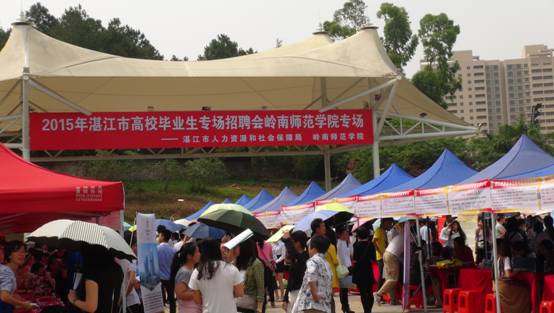 为做好我校毕业生就业工作,搭建毕业生就业平台,25日上午,由湛江市人社会局、岭南师范学院联合举办的“2015年湛江市高校毕业生专场招聘会岭南师范学院专场”在我校雷阳广场成功举办。本次招聘会共有徐闻市教育局、湛江及珠三角等地区共80家企事业单位进场“招兵买马”,提供毕业生就业岗位共1204个, 527人初步达成就业意向。