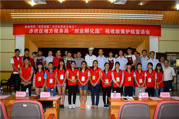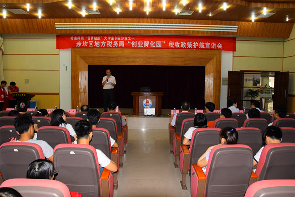 4月25日下午,由学生处、招生就业处、赤坎区地方税务局共同举办的“创梦起航”大学生创业沙龙之“创业孵化园”税收政策护航宣讲会暨金点子分享活动在图书馆学术报告厅举行。学校党委刘海涛副书记,赤坎区地方税务局党组书记、局长王立,湛江市地方税务局程纯阳科长等相关税务机构领导,招就处钟炳辉处长、李博副处长,学生处陈永国副处长,“大学生勤工助学创业孵化园”全体学生员工、对创业感兴趣的高年级学生参加了本次活动。