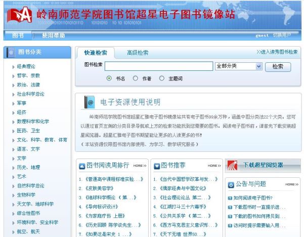 链接:读者可在校园网范围内登录http://202.192.129.24;或访问图书馆网站,在电子图书资源列表中找到超星电子图书访问地址。下载并安装“超星阅览器”后,利用网页检索功能,或利用分类目录,查到所需图书即可在线阅读、下载图书,并利用操作平台实现一些个性化需求;二是利用图书馆大厅的歌德电子书借阅机。首先在手机上下载安装超星移动图书馆或歌德电子书阅读器,然后选择类别点击需要的图书,这时会有该书的二维码弹出,用手机对其一扫,整本电子书就“装”进手机里了。下载过程不到1分钟,非常快捷。该机内置2000种近三年的超星独家版权畅销书籍,涵盖文学名著、少儿教育、社会法律、经营励志等十三个类别,并且每月自动更新最新图书100种。