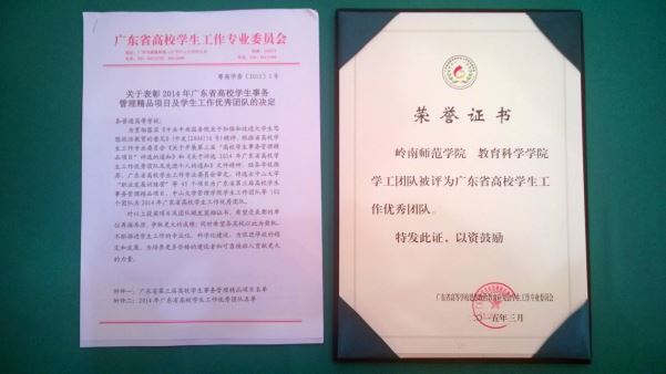 3月16日,在我校召开的广东高校2015年度学生工作会议上传来喜讯:我校教育科学学院学工团队以成员素质高、团队科研好、育人平台佳、育人成效显、学生德行美、学生创新强和学生就业好等特点得到肯定,被评为广东省高校学生工作优秀团队,受到了表彰。教科院学工团队的参评材料还被省高校学生工作专业委员会向全省各高校推介。