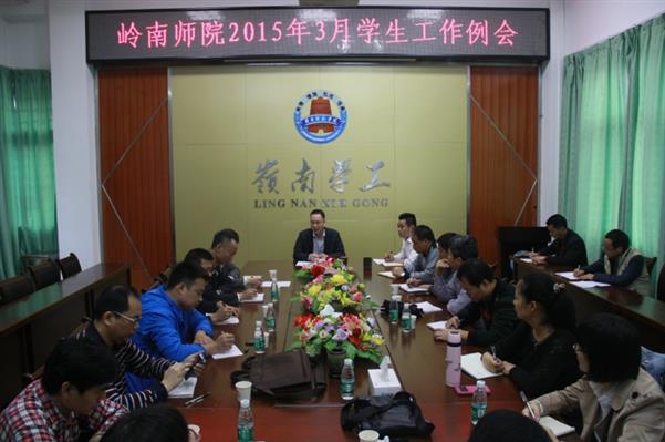 为了做好会议的承办工作,学生处先后组织召开了广东高校2015年度学生工作会议筹备会、3月学生工作例会以及3月全体辅导员例会。在会议上,学生处李粤处长向相关行政部门介绍了会议的筹备情况,协调各项工作;向各二级学院学工办做了工作的部署,要求各学工办集中力量,全力配合,狠抓学生课堂纪律和公寓纪律。全校学工干部群策群力,在全校范围努力营造良好的学习氛围,以良好的精神风貌和校园秩序迎接广东高校2015年学生工作会议的召开。