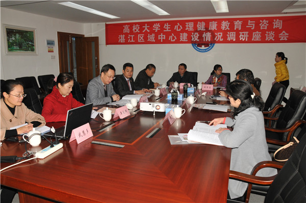 学生处李粤处长从学校领导重视、我校示范中心建设以及区域中心建设三个层面汇报了2014年大学生心理健康教育与咨询湛江区域中心建设过程中的举措、取得的成效以及存在的问题。专家组对我校牵头开展的区域中心建设工作给予了极大的肯定,指出我校为区域中心建设做了大量的工作,工作扎实到位,此次建设情况汇报准备充分,会议手册中展示的区域中心建设材料是所走访的几所区域中心所在高校中最为完善的。