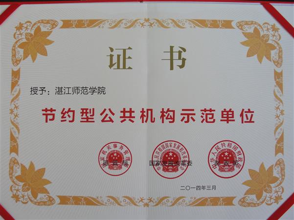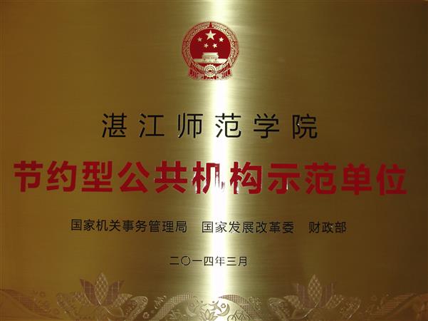 —— 2014年12月,我校获国家机关事务管理局、国家发展改革委、财政部联合颁发的“节约型公共机构示范单位” 牌匾和证书。同时,我校申报的公共机构节能专项资金申报项目被列入广东省公共机构节能专项资金项目计划,获50万元奖励。