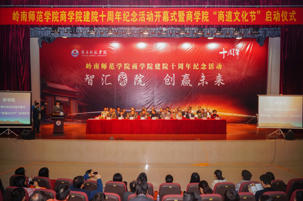 开幕式正式开始前,播放了商学院建院十周年专题视频片《奋发图强勤耕耘,传播商道育英才——岭南师范学院商学院十年办学历程掠影》。十年来,在学校领导和职能部门的关怀和支持下,商学院发展迅速,在学生规模、师资队伍、办学条件等方面都发生了翻天覆地的变化,人才培养、科学研究、社会服务、文化传承方面也取得不俗的成绩。