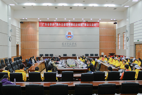 12月3日下午,省侨办“海外华裔青年禅武研修班”来访交流会在我校国际会议厅举行,参加本次交流会的嘉宾有广东省侨办文教处的汤泗昌处长、侯瑜副处长、何传普科长,禅武中心的朱振武校长、办公室史方圆副主任、陈世朝顾问、陆广生顾问、刘剑恒教练和带班老师吴晓丹及33名学员。此外,我校黄刚副院长、体育科学学院章晓霜院长、音乐学院孙建华院长、美术学院巨云和院长、人文学院刘惠卿院长、国际交流与合作处郑志军副处长参加了会议,会议由郑志军副处长主持。