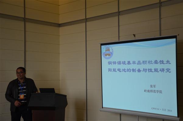 11月19-21日,由中国可再生能源学会、国家可再生能源中心联合主办,中国可再生能源学会光伏专业委员会承办的第14届中国光伏大会(CPVC14)暨2014中国国际光伏展览会(CPVExpo) 在北京国际展览中心举行。我校物理科学与技术学院张军博士应邀参会,并作题为《铜锌锡硫单晶颗粒柔性太阳能电池的制备与性能研究》的特邀报告。