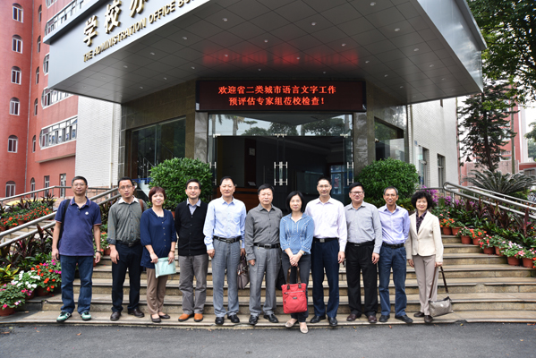 岭师新闻中心讯:今年年底湛江市将接受广东省二类城市语言文字工作评估,我校是重点受检单位。11月26—27日,广东省二类城市语言文字工作评估专家组到湛江市进行语言文字工作预评估。27日上午,省语委办领导张毅带领省评估专家组一行莅临我校。校领导黄钢副院长和教务处副处长谭荣波对专家组的到来表示热烈的欢迎,随后带领专家组一行巡查校园的用字环境。