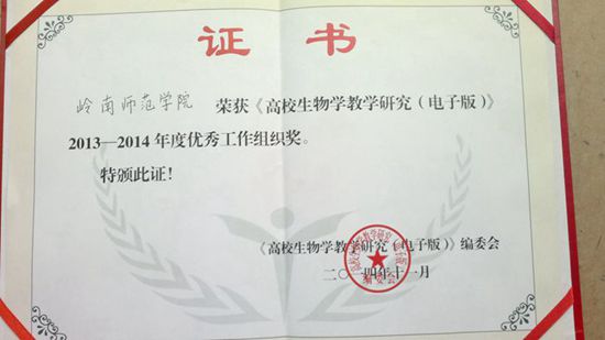 由全国高等学校教学研究中心、教育部高等学校生物学相关教指委和高等教育出版社共同主办的第九届高校生命科学课程报告论坛于2014年11月21 - 24日在山东济南召开。参加大会的有全国200多所院校600余代表。会议期间同时召开了《高校生物学教学研究(电子版)》第二届编委会第一次会议,我校被评为2013 ~ 2014年度优秀工作组织奖。曾富华教授代表学校在大会上领奖。