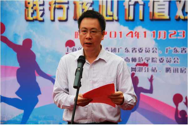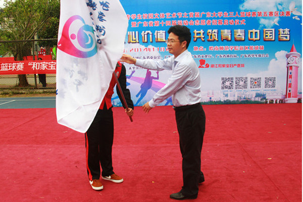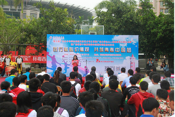 11月23日上午,以“践行核心价值观,共筑青春中国梦”为主题的第九届广东大中专学生校园文体艺术节之首届广东大学生三人篮球赛第五赛区总决赛暨广东省第十四届运动会志愿者招募启动仪式在岭南师范学院新区篮球场隆重开幕。