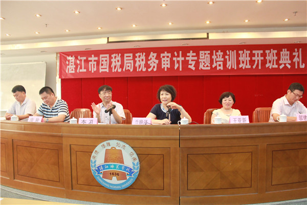 9月26日上午,2014年湛江市国税局第一期税务稽查审计专题培训班开班典礼在我校园府酒店1号会议室举行。培训班开班典礼由商学院邬建平副院长主持,岭南师范学院总会计师兰艳泽教授、商学院院长王亚新博士、湛江市国税局党组成员总会计师李孔总会计师、国税局督查局局长庞秋、国税局大企业和国际税务管理科负责人陈光出席了开班典礼。