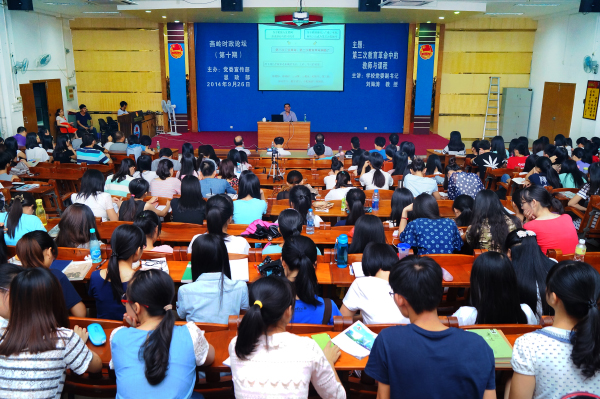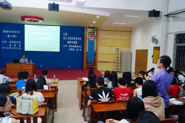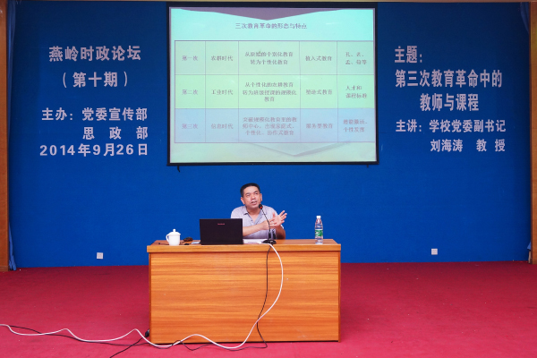 岭师新闻中心讯:26日晚,由学校党委宣传部和思政部主办的第十期“燕岭时政论坛”在弘雷楼311室举行。论坛邀请了学校党委副书记刘海涛教授主讲“第三次教育革命中的教师与课程”。学校党委宣传部陈恕平部长、关天冲副部长;思政部何增光主任、洪小瑛副主任、童小彪副主任;思想政治理论课教学部全体教师和《形势与政策》课上课学生近300人参加了论坛。论坛由思政部主任何增光教授主持。