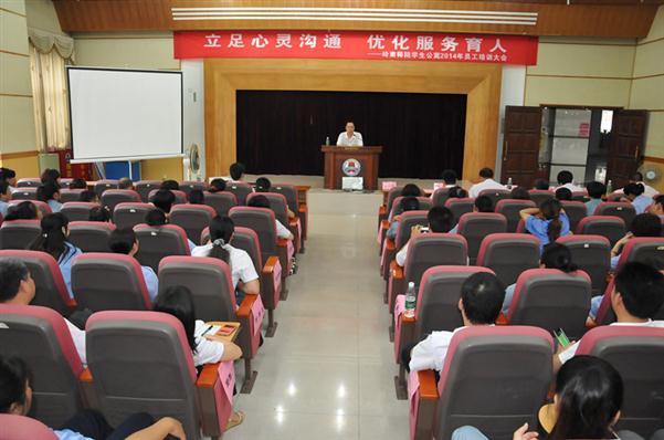 8月27日,学生处举办了主题为“立足心灵沟通 优化服务育人”的学生公寓员工培训大会。这是2012年“强化执行力建设”主题培训和2013年“实践群众路线,强化岗位责任”主题培训后,连续第3年举办的学生公寓常规化全员培训,是学生处结合学生公寓工作的实际和发展,每年确定一个主题,利用暑假进行的集中培训。培训的主要目的是通过回顾工作,进行总结表彰、统一思想、提升认识、改进工作。学校党委彭权群副书记、学生处李粤处长、陈永国副处长以及学生公寓管理中心的全体员工参加了此次培训。陈永国副处长主持培训大会。