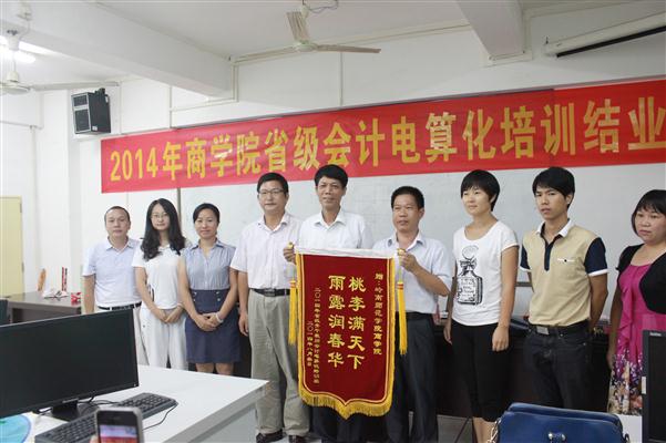 8月4日下午,广东省2014年中职院校会计电算化专业骨干教师培训班结业典礼在商学院ERP沙盘模拟实验室举行。来自全省中职院校会计电算化专业的34名骨干教师参加结业典礼,自发向商学院赠送“桃李满天下,雨露润春华”的锦旗。