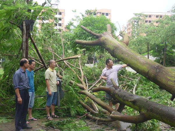 7月18日19时30分前后,超强台风“威马逊”在我市徐闻县沿海二次登陆,17级风力正面横扫雷州半岛。受台风“威马逊”影响,从7月18日晚到19日上午,整座校园被狂风暴雨裹挟,校内多处已绑扎加固的树木被连根拔起,满地断枝、落叶和杂物,积水和淤沙阻塞校道排水,学校各主干道的交通出行受到严重影响。19日凌晨,风力略有减弱后,学校后勤产业处班子成员就组织后勤员工,第一时间赶赴校园风灾现场,落实灾后恢复工作。