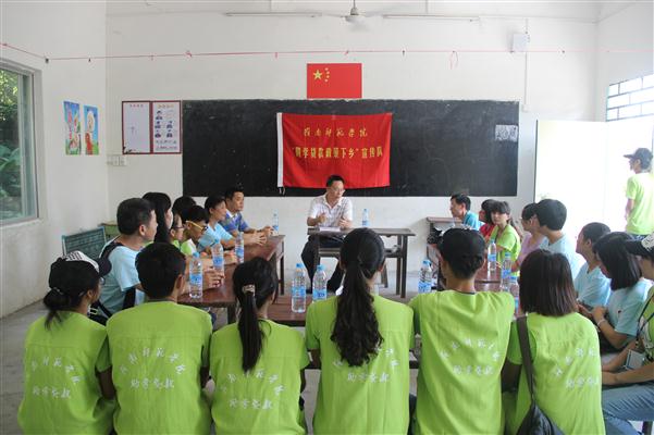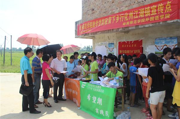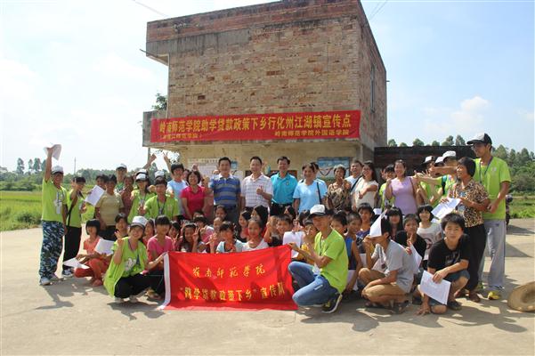 链接:作为入选广东省教育厅21所开展助学贷款政策下乡宣传活动的高校,岭南师范学院助学贷款工作始终走在全省前列,曾连续四年在省工作考核中评为“优秀”。为做好今年的政策下乡宣传活动,根据教育厅工作部署,岭南师院学生处组建了总数达250人的14支国家助学贷款政策下乡宣传队伍,其于暑假期间分赴粤西各地以及粤北开展2014年暑期助学贷款政策下乡行宣传活动,其中学生处还专门组建一支由学贷中心助理及二级学院熟悉助学贷款政策学生组成的宣传队,由学生处陈永国、易如副处长带队,湛江出发,远赴清远阳山进行下乡宣传。各“助贷政策下乡”宣传队通过在圩镇集市、中小学进行宣讲、进入农户家访慰问、用微信微博作政策解读等方式进行宣传,真正做到让将国家助学贷政策宣传深入到基层,深入人心,让广大寒门学子真正感受到政府关怀,看到了改变命运,继续求学的希望。