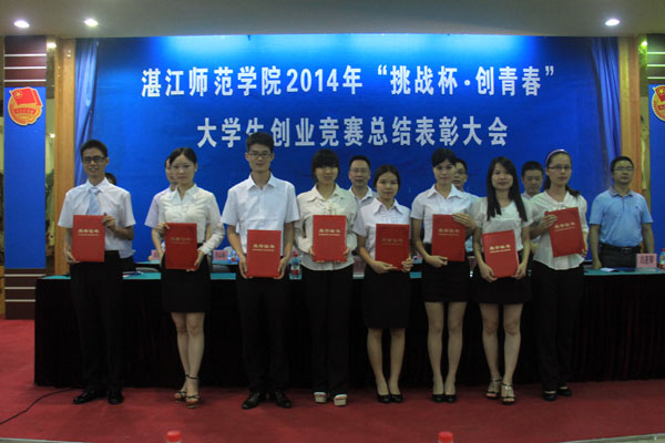 弘扬学术,激励创新。6月26日晚,我校在教三311隆重举行2014年“挑战杯·创青春”学生创业竞赛总结表彰大会。学校党委彭权群副书记、校团委郭和才书记、生科院陈道海院长、产业技术研究院冯宗财常务副院长、人文学院刘惠卿院长、法政学院袁铎院长、信科院许棠院长、音乐学院孙建华院长、图书馆陈俊群馆长、教务处周立群副处长、教科院郑剑虹副院长、美术学院乔志强副院长、思政部洪小瑛副主任、湛江市点点来公司张明明副总经理以及部分二级学院党委副书记、指导老师和学生代表出席了大会。会议由校团委李亚九副书记主持。