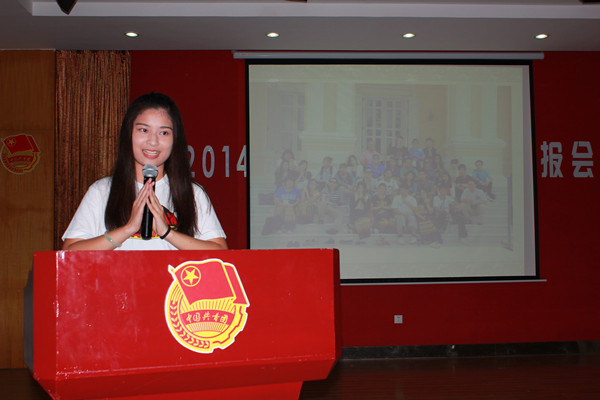 汇报会上,上届东盟青年营成员,现已考取香港理工大学研究生的彭霖霖同学做了简单精彩的汇报,她结合外国文化、习俗的差异,悉心地为同学们指出去东盟国家时要注意的地方。同学们深受启发,颇有感悟。